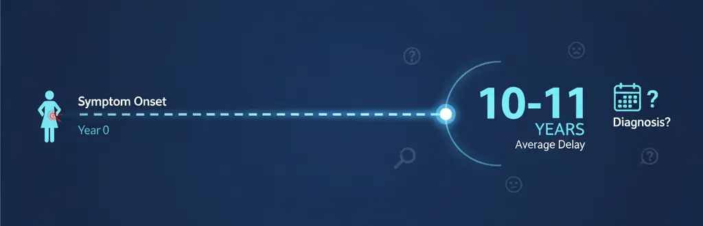 Long delays are common. Studies consistently report that women wait many years to be diagnosed. For example, one review found women often wait up to 10–11 years from symptom onset to diagnosis. Many see multiple doctors (an average of 5 visits) before a specialist suspects endometriosis. These delays mean more time spent in pain and uncertainty.